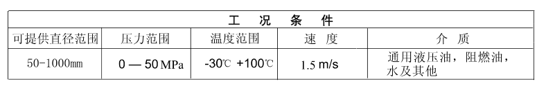 可提供直徑范圍壓力范圍溫度范圍速度介質50-100mm0-50Mpa-30℃+100℃1.5m/s通用液壓油,阻燃油,水及其他