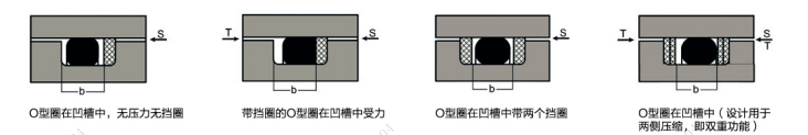 如果壓力超過(guò)50bar(5MPa),則應(yīng)在O型圈上的基礎(chǔ)上加一個(gè)擋圈,并將間隙縮小到接近0毫米。