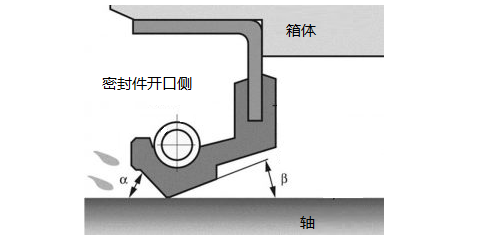 那為什么兩個方向會有區(qū)別呢?這其實主要來源于油封的設計原理。大家可以參考下圖。在主要起作用的密封唇口區(qū)域,左右兩側的角度大小是不一樣的。目前常見骨架油封的設計是密封件開口側(也稱彈簧側、流體側fluid side)的角度α比另外一側(也稱空氣側air side)的角度β大。為了和其它文獻統(tǒng)一,下面我們統(tǒng)一稱為流體側和空氣側,不過大家知道代表的是哪一側就可以了。